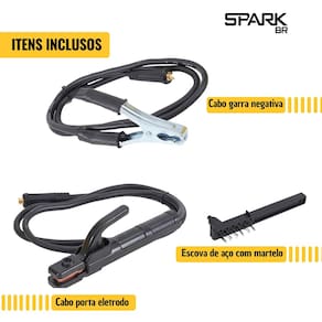 Itens Inclusos: • 1x Máquina Inversora Spark BR AMG-W01; • 1x Máscara de proteção; • 1x Braçadeira de terra; • 1x Porta eletrodo; • 1x Escova de aço com martelo; • 1x Alça de transporte; • 1x Manual de instruções.