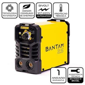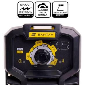Máquina de Solda Inversora ESAB Bantam 2.5 Bivolt 110v/220v A Máquina de Solda Inversora ESAB Bantam 2.5 traz um novo conceito de máquinas portáteis, com alta tecnologia dos inversores ESAB, ideal para serralheiros e usuários finais que necessitam realizar projetos dentro e fora da oficina. Seguindo a tradição da marca, Bantam é sinônimo de um equipamento seguro, robusto e confiável, capaz de acompanhar o soldador onde o trabalho estiver. ALTO DESEMPENHO - Excelente soldabilidade e fácil abertura de arco com eletrodos E6013. A Bantam 2.5 é ideal para eletrodos de até 2,5mm; BIVOLT - Tensão de alimentação automática de 127V e 220V; PRATICIDADE - Com alça de ombro para transporte, a Bantam é compacta e cabe no armário de ferramentas, em uma mochila e até no baú da moto; PAINEL FÁCIL - Ajuste dos parâmetros de acordo com a bitola do eletrodo, tornando-a mais intuitiva e fácil de regular; ECONOMIA - Alta eficiência energética que garante o menor consumo de energia. Ao escolher a Bantam o soldador conta com e assistência técnica padrão ESAB. Oferecemos 1 ano de e a maior rede de assistência técnica do Brasil, garantindo tranquilidade aos nossos clientes com disponibilidade incomparável de peças, assegurando a manutenção e durabilidade das máquinas. Marca: Não Informado