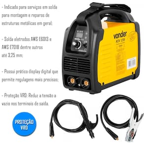 Equipamento leve e compacto, com apenas 3,5 kg, apresenta baixo consumo de energia e alimentação 127 V~ ou 220 V~ com reconhecimento automático. Possui Arc Force, que evita que o eletrodo grude na peça durante a soldagem, e também as funções Hot Start, que auxilia na abertura do arco, e Anti Sticking, que diminui a corrente caso o eletrodo fique grudado, evitando danos ao eletrodo e também ao equipamento. Conta com display digital, que permite regulagens mais precisas, e de sensor de sobreaquecimento. Conta ainda com função VRD que reduz a tensão nos terminais de saída, que garante uma segurança maior para o operador contra choque elétrico.