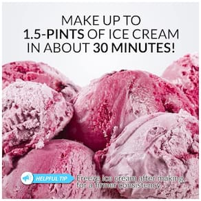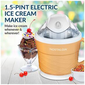 Máquina de sorvete elétrica Nostalgia 1,4L para sorvetes, iogurtes e gelatos caseiros em 20 minutos. Inclui tampa para armazenamento e alça para transporte.Bowl de congelamento