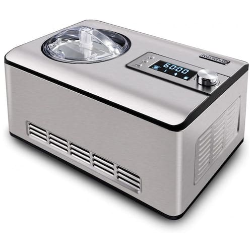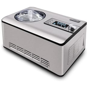 Máquina de sorvete automática em aço inoxidável com capacidade de 2L, tela LCD, potência de 180W, compressor embutido e 4 modos de operação: sorvete, iogurte, resfriamento e mistura.Bowl de congelamento