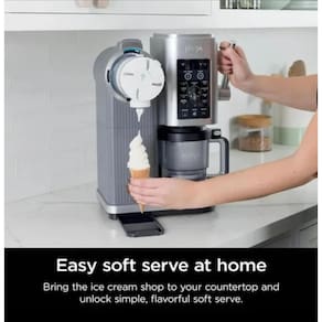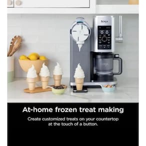 Máquina de sorvete 13 em 1 com dispenser italiano, 2 potes de 480ml com sistema de nozzle, tampa de espiral, haste de dispenser com três velocidades, tigela externa, paddde creamerizer, bandeja coletora e livro de receitas. Motor de 800W. Componentes removíveis (exceto base) são BPA free e podem ir na lava-louças. Permite fazer sorvete em bola e soft serve.Bowl de congelamento