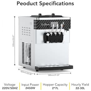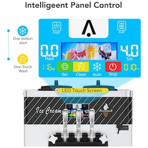Esta máquina de sorvete soft comercial GAOMON foi desenvolvida para alta produtividade, com capacidade para produzir de 22 a 30 litros por hora. Possui dois recipientes em aço inox 304 com capacidade individual de 7 litros cada, garantindo durabilidade e resistência à corrosão. O equipamento apresenta tela sensível ao toque de 5,5 polegadas que exibe dados essenciais como dureza do sorvete, voltagem e quantidade produzida, facilitando o monitoramento e a operação.