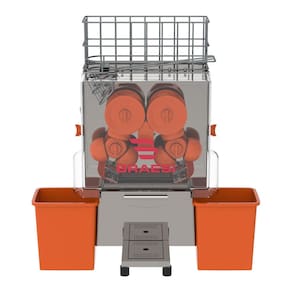 A máquina vem equipada com um cesto para armazenamento organizado das frutas e um guia de abastecimento que facilita o processo de inserir as laranjas no espremedor, otimizando o fluxo de trabalho.