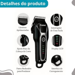 Máquina de tosa kemei km-1991 portátil Descrição do anúncio: A máquina de tosa pet bivolt kemei km-1991 é ideal para tosar animais de pequeno e médio porte de forma eficaz e segura. Equipada com lâmina de aço inoxidável, possui tela lcd digital para monitorar a bateria e opera silenciosamente, garantindo conforto para o pet. Conteúdo da embalagem: Máquina km-1991 Fonte bivolt 4 pentes guia 3mm, 6mm, 10mm, 13mm Bisnaga com silicone Pente Cortador de unhas Lixa Manual do usuário Características: Sem fio Tensão bivolt Potência de 5w Lâminas de aço inoxidável ajustáveis 0,5 mm a 1,0 mm Motor de alta velocidade Carregamento rápido 3 horas Autonomia de até 120 minutos 4 pentes guia 3mm, 6mm, 10mm, 13mm Especificações: Material: abs de alta qualidade Tela lcd Sistema de corte r-shape Tempo de carregamento: 3 horas Tempo de uso: até 120 minutos Tensão de entrada: 5v Corrente: 1000ma Principais perguntas sobre o produto e respostas: 1 é indicada para pets de médio e grande porte Sim, eficaz para animais de qualquer tamanho. 2 o produto é resistente Sim, feito com materiais de alta qualidade e durabilidade. 3 tempo de carregamento da bateria Aproximadamente 3 horas. Marca: Não Informado Ean: 7905276309617