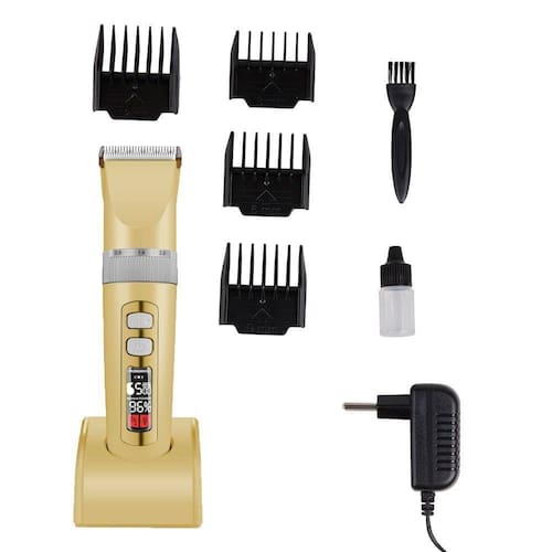 A velocidade do motor chega até 6500 RPM. Display em LCD digital, mostrando nível de bateria e velocidade. A lâmina que vem com a máquina é fabricada em aço, revestida em Titânio, com cortante de cerâmica, que não aquece e, por isso, não fere o animal.