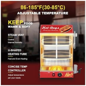 A Máquina de Vapor para Cachorro-Quente Nessxa de 40 litros possui uma grande capacidade que permite controlar facilmente festas ou clientes na loja. Perfeita para uso diário e comercial, é feita de aço inoxidável para garantir a segurança alimentar. Seu design com bandeja removível facilita a organização e limpeza. A temperatura pode ser ajustada entre 30°C a 85°C para manter os cachorros-quentes quentes e suculentos conforme necessário. Ajuste de temperatura rápido e aquecimento eficiente. Feita de aço inoxidável de alta qualidade, suporta grandes quantidades de comida sem deformar. Capacidade para 235 cachorros-quentes e 50 pães simultaneamente. Ideal para cafeterias, padarias, restaurantes, e lojas de conveniência. Display de alimentos com vidro temperado espesso, isolante e transparente. A porta deslizante facilita a visualização e manuseio dos alimentos. Uma adição necessária para qualquer estabelecimento de alimentos.