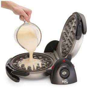 Máquina de Waffle rotativa com design profissional, capacidade para 4 fatias, base de dupla função para assar e armazenar, exterior em aço inoxidável escovado e interior antiaderente.Porta-fio