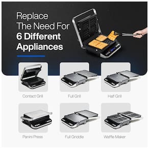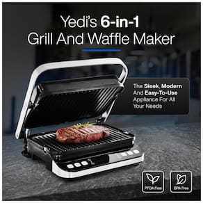 6 em 1 GRILL A grelha Yedi funciona como uma grelha de contato, máquina de waffle, prensa panini, grelha completa, grelha completa, meia grelha e meia grelha com faixas de temperatura de 62 a 232 graus Celsius.