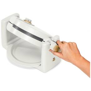 Máquina de waffle belga giratória com 1000W de potência, 7 níveis de dourado, chapas antiaderentes sem PFOA e PFOS, bandeja coletora removível e alça com toque frio. Inclui indicadores luminosos de ligado e pronto.Porta-fio