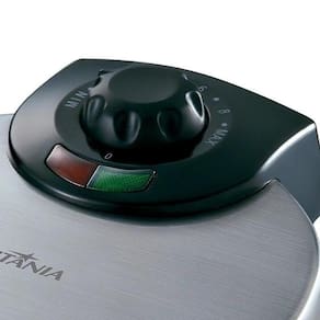 Prepara até 4 waffles por vez, com placas antiaderentes, base antiderrapante, luz indicadora de funcionamento, controle ajustável de temperatura e porta-fio.Porta-fio
