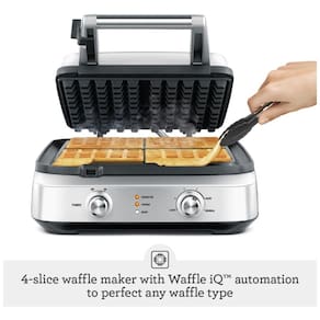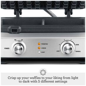 Máquina de Waffle Breville BWM604BSS com capacidade para 4 fatias, ajuste de temperatura para diferentes estilos de waffle e sistema anti-bagunça.Porta-fio
