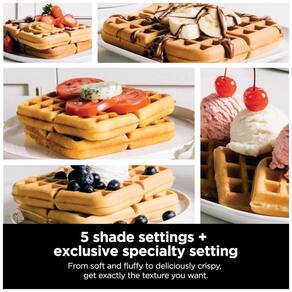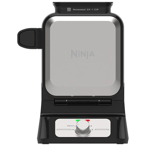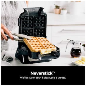 Máquina de Waffles Ninja BW1001 NeverStick PRO com design vertical, 5 configurações de dourado, waffles belgas de 2,54 cm, configuração para massas com alto teor de açúcar, copo de medida preciso e alertas audíveis e visuais.Porta-fio