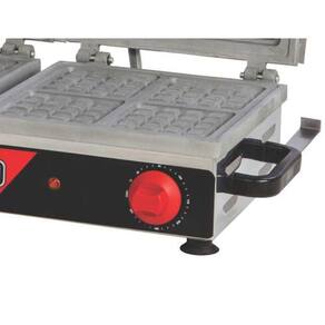 Possui termostato com controle de temperatura que vai de 0 a 300C e lâmpada piloto para indicar quando a temperatura desejada é atingida. A waffeleira conta com puxador antitérmico para que o operador possa manusear o equipamento com segurança.