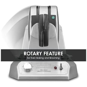 Máquina de Waffle Waring WW200, com capacidade para preparar dois waffles simultaneamente. Possui placas antiaderentes removíveis, controle de temperatura, indicadores LED e design vertical para economizar espaço.Porta-fio