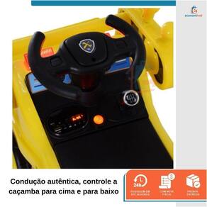 Maquina Escavadeira Infantil Grande Articulado Baby Style Amarela A Escavadeira é ideal para dar aos seus filhos uma experiência de condução autêntica, esta escavadeira montável imita o trator de verdade e permite que seus filhos controlem a caçamba para cima e para baixo para diversão sem fim. Equipado com uma pá enorme e braços e articulações flexíveis, as crianças podem operar o trator com facilidade. Luzes realistas do volante e luzes traseiras que operam com pá totalmente controlável. Com um cinto de segurança, os filhos permanecem sentados e uma velocidade limitada de 3 km / h não é perigosa, mesmo para crianças pequenas.- Função musical;- Faróis e luzes traseiras;- Pá totalmente controlável e braços e articulações flexíveis.CARACTERÍSTICAS TÉCNICAS:Material: PP e açoMedidas: 53cm altura x 41,2cm largura x 106,9cm comprimento Idade recomendada: Acima de 3 anosPeso suportado: Até 30kgTempo de carregamento: 8 a 12hTempo de uso: 1h Velocidade máxima: 3 km/hBateria: 6VPeso: 7,6kgMarca: Baby StyleRef.: 998540Homologação Inmetro: CE-BRI/IQB 006429 54879/21-004