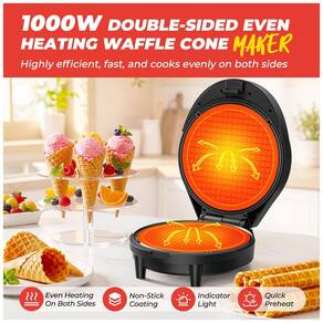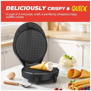 O modelo permite preparar cones crocantes, rolinhos de ovo, waffles egres e stroopwafels holandeses em 2-3 minutos. A estrutura em plástico acomoda uso doméstico frequente em cozinhas residenciais.