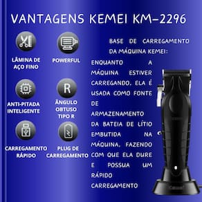 A kemei km-2296 oferece cortes precisos, conforto e alta performance, ideal para cuidados pessoais ou . -conteúdo da embalagem: 1 máquina 1 escova 1 cabo usb 8 pentes 3/6/9/13/16/19/22/25mm 1 base de carregamento 1 oléo de lubrificaçâo -características: Especificações técnicas: Marca: kemei Modelo: km-2296 Cor: preto Tensão: 100-240v Motor: muito potente Materiais: abs Bateria: 2500mah Tipo de fonte de alimentação: recarregável Uso: rosto, barba, bigode, barbeiro Potência: 5w Peso do pacote: 350g Tamanho da embalagem: 18 x 5,5 x 4,5 centímetros Tempo de carregamento: 3,5 horas Tempo de uso: 350 minutos :: prazo de envio Após a confirmação do pagamento em :: atendimento Caso tenha dúvidas, utilize os canais de atendimento. Possuímos uma equipe altamente qualificada para respondê-los a rapidamente. :: pós-venda Não tenha dúvidas nós vendemos bem para vendermos sempre conte com nosso Atendimento em horário comercial sempre que precisar. :: dicas de compra 1. Leia todo o anúncio antes de comprar. 2. Verifique se seus dados de contato estão atualizados no momento da compra. 3. Confira o seu endereço de recebimento, pois não temos como alterá-lo. :: Este produto possui de 3 meses contra defeitos de fabricação á partir do Recebimento. Para acionar a será necessário enviar o produto de volta junto com Suas embalagens recebidas, por isso é de suma importância guardar e conservar as embalagens. Marca: Não Informado Ean: 7798796451344