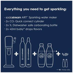Faça água com gás fresco com o apertar de um botão. Inclui: máquina de água com gás, 2 cilindros de Co2 60L, 1 Botle para máquina de lavar louça Twin Pack e 2 sabores de gotas borbulhantes de 40 ml Eficiente energético, alimentado por cilindro de Co2. Cada cilindro de Co2 carbonata até 60 litros de água. Inserção de garrafa de encaixe fácil de usar para carbonatação rápida Compatível com todos os sabores SodaStream e garrafas de carbonatação SodaStream BPA livre e melhor para o planeta, exceto a garrafa de vidro SodaStream As máquinas SodaStream Art são compatíveis apenas com o cilindro de CO2 SodaStream Quick Connect