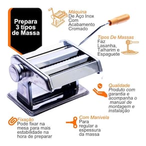 Maquina de massas caseira inox 3 massas manualversatilidade na cozinha: a máquina de massas caseiras em inox oferece a flexibilidade de preparar cinco tipos de massas deliciosas: talharim, espaguete e lasanha. Uma adição perfeita para suas refeições em família.Fácil de usar: criada especialmente para amantes da gastronomia, esta máquina possui um grampo sargento que facilita o manuseio, conforme as instruções do manual. Seja para uso comercial ou caseiro, você poderá desfrutar de massas frescas feitas sob medida.Construção durável: feita de aço inoxidável de alta qualidade, a máquina é durável e resistente. Sua estrutura permite uma limpeza fácil e manutenção sem esforço.Ajuste de espessura: com três regulagens - talharim, espaguete e massa laminada para lasanha, pastéis e muito mais - e um botão de regulagem de espessura que oferece até 6 opções diferentes, você pode personalizar suas massas de acordo com suas preferências.Especificações técnicas:características:composição: 1 máquina de massa, 1 manivela, 1 grampo sargento para fixar na mesa.Material: inox.Medidas aproximadas: altura 13cm x comprimento 18,5cm x largura 20cm x largura do cilindro 14,5cm.Características específicas:possui 3 regulagens: talharim, espaguete e massa laminada para lasanha, pastéis e mais.Botão de regulagem de espessura da massa com até 6 espessuras diferentes, medidas em polegadas e milímetros.- espessuras em polegadas/milímetros:1 - 0,125 - 3,175 mm2 - 0,95 - 2,413 mm3 - 0,85 - 2,159 mm4 - 0,75 - 1,905 mm5 - 0,65 - 1,651 mm6 - 0,55 - 1,397 mmimagens meramente ilustrativasgarantia do vendedor: 30 dias