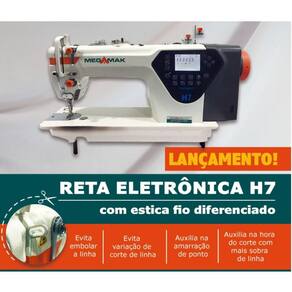 Maquina de Costura Reta Eletrônica Megamak com motor Direct Drive, lubrificação automática e lançadeira pequena. Possui corte de linha, levantamento de calcador, retrocesso inicial e final e parada de agulha automáticos, diferenciais que aumentam a velocidade da operação. Utilizada na confecção em geral como malha, lingerie, moda praia, jeans, entre outros.