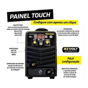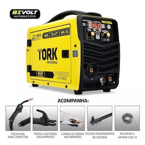 Maquina solda inversora mig sem gás 160a mma tig trisolda 50/60hz tork 127/220v Máquina de solda inversora mig sem gás 160a mma tig trisolda Super tork touch 160 trisolda - compacta, versátil e de alta tecnologia Processos de soldagem: Mig sem gás: ideal para soldagem de chapas automotivas e estruturas metálicas. Tig: acabamento superior em chapas finas. Mma eletrodo revestido : alta versatilidade para diferentes materiais. Profissionais e iniciantes, permitindo soldar com qualidade mesmo sem experiência prévia. Cor: amarelo, com design robusto e prático. - características: Frequência: 50/60 hz Voltagem: 127/220v bivolt automático Potência: 6.400w Amperagem: 20a 160a Ciclo de trabalho: 60% Diâmetro do arame: Mínimo: 0,6 mm Máximo: 1,0 mm Diâmetro do eletrodo: até 4 mm Materiais soldáveis: aço, chapa, aço inox, alumínio Peso: 4,2 kg Classe de isolamento: classe f Dimensões: compacta e fácil de transportar com alça integrada. Proteção: contra sobrecarga e função anti-stick. - itens inclusos: Garra negativa Porta eletrodo Manual do usuário Roldana de tração 0.8/1.0 Tocha mig nine-conector - : 1 ano de fabricante Marca: super tork Modelo: touch 160 trisolda imets-8160-5k-bv Código de barra: 7898533564846 Imagens meramente ilustrativas, podendo sofrer pequenas alterações. Todas as informações divulgadas são de responsabilidade do fabricante/fornecedor Marca: Não Informado