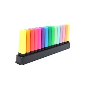 Tipo: Pincel Marca Texto Quantidade de Cores: 15 9 fluo e 6 pastel Modelo: KZ6018 Tinta: À base de água Ponta: Chanfrada Espessura do Traço: 2 mm Material do Corpo: Resina Diâmetro: 2 cm Extras: Estojo organizador, tinta lavável