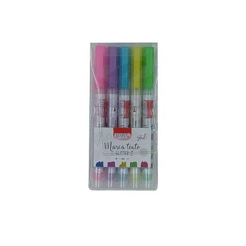 Marca Texto BRW Soul Glitter CA2017 5 cores Marca texto glitter. Uma linha de marcadores que dará um brilho e lindo destaque aos seus textos. É perfeita para fazer com que suas palavras realmente se destaquem na página, seus barris estreitos, parecidos com uma caneta, os tornam perfeitos para todas as idades e resultam em menos cansaço do que suas contrapartes mais volumosas - Contém cinco marcadores glitter - Cores: amarelo, azul, verde, roxo e rosa - Composição: resinas termoplásticas, tinta á base de água, corantes, aditivos, glitter e ponta de poliéster - Possui uma ponta de ponta de cinzel que oferece uma linha de até 3,5 mm. Marca: Bwr