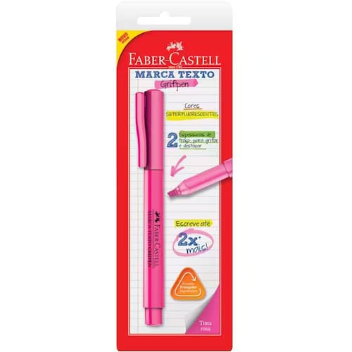 O Marca Texto Grifpen da Faber-Castell possui a ponta chanfrada, que possibilita traços finos e grossos a depender da posição que a ponta é colocada no papel. Seu formato triangular garante maior conforto ao escrever e as cores são superfluorescentes. Ah, a tinta não passa para o outro lado da folha viu?