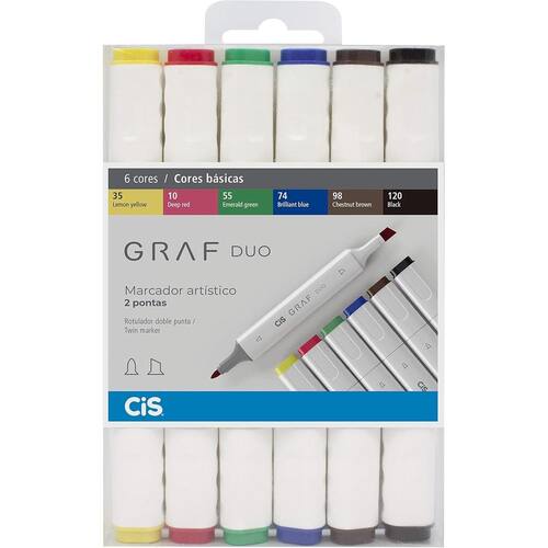 CIS GRAF DUO é um marcador com 2 pontas, sendo uma média e uma larga chanfrada. Possui a tinta pigmentada à base de álcool, com secagem rápida, não tóxica e permanente. Cores vibrantes que irão alegrar a vida dos fãs de papelaria, escolar, lettering, ilustrações, design de moda e arquitetura.