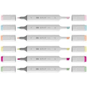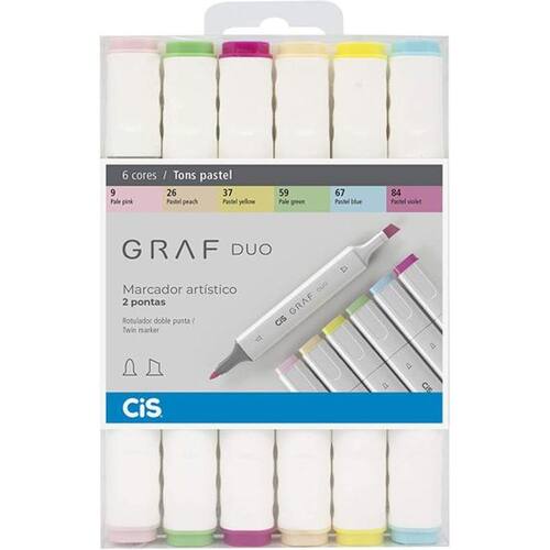 CIS GRAF DUO é um marcador com 2 pontas, sendo uma média e uma larga chanfrada. Possui a tinta pigmentada à base de álcool, com secagem rápida, não tóxica e permanente. Cores vibrantes que irão alegrar a vida dos fãs de papelaria/escolar, lettering, ilustrações, design de moda e arquitetura. Permite sobreposição de cores com excelente opacidade. É aconselhável que o marcador seja utilizado em papéis com gramaturas acima de 180 grs. Possui um design ergonômico, é uma ótima escolha para quem procura qualidade e versatilidade.O estojo contém 6 cores, em tons pastéis: Pale Pink, Pastel Peach, Pastel Yellow, Pale Green, Pastel Blue e Pastel Violet. Possui em média 1 dia de resistência caso a caneta fique destampada.