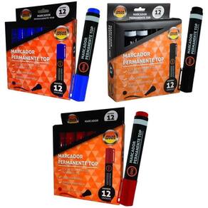 36 marcador permanente top preto - jocar office 3 caixas = uma caixa de cada cor Composição: resina termoplástica, ponta de fibra e tinta à base de corantes e solventes. Trabalhamos com responsabilidade e dedicação. Entregamos 100% das mercadorias no prazo. Estamos no ramo ha mais de 35 anos. Nossas embalagens são todas de qualidade e nossos embaladores são ótimos profissionais. Só trabalhamos com marcas . Caso compre depois desse horário enviamos somente no dia seguinte. Descrição: Cores: preto // azul // vermelho Altura: 125mm. Diâmetro: 18mm. Marca: jocar office Quantidade: 36 unidades no total = cada caixa com 12 unidades Características do produto: Corpo com novo design. Tinta permanente. Ponta chanfrada 4,5mm. Atóxico.