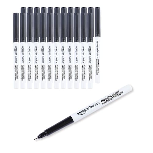 Amazon Basics Marcadores permanentes de ponta ultrafina, preto, pacote com 24 - Marcador permanente (pacote com 24) com tinta preta ousada; ideal para casa ou escritório, seja escrevendo, rabiscando ou desenhando - Ponta ultrafina para delineamento e detalhes de alta precisão; sem pular ou vazar para resultados suaves e limpos - Tinta de longa duração, secagem rápida; à prova de manchas e resistente ao desbotamento - Funciona em praticamente qualquer superfície, incluindo fotos, plástico, madeira, pedra e metal - Não tóxico; em conformidade com ASTM-D4236