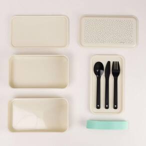 Contém 1 marmita com 2 camadas, 1 garfo, 1 colher, 1 faca e 1 laço.