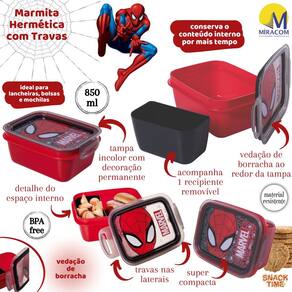 Pote Marmita com fechamento Hermético por vedação de borracha, com Trava Dupla, retangular, colorido e com tampa incolor com decoração permanente. Tem capacidade para 850ml. Conta ainda com 1 compartimento removível para melhor acomodação e separação dos alimentos. Conta com decoração de um dos personagens mais queridos das crianças, o Homem Aranha. O produto é fabricado pela Plasútil e é oficialmente licenciado pela marca.
