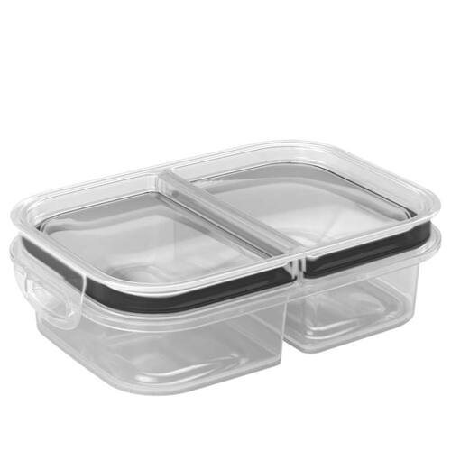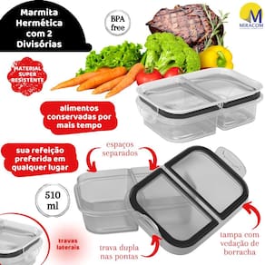 Pote Marmita 2 Divisórias com fechamento Hermético por vedação de borracha, com Trava Dupla, retangular e totalmente incolor. Tem capacidade total para 510ml. Tanto o pote principal quanto a tampa são 100% transparente, para melhor identificação dos alimentos. Conta com uma tira de borracha na tampa, que auxilia na conservação do conteúdo interno por mais tempo. O produto é produzido pela Plasútil e todos os seus componentes são fabricados em polipropileno de alta densidade, atóxicos, totalmente seguros para a saúde/alimentação e livres de bisfenol-A em sua composição (BPA Free).