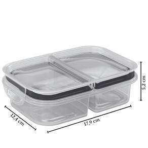 Para uma melhor higienização, o pote é composto exatamente por 2 peças, à saber: 1 recipiente principal incolor retangular com duas divisórias e 1 tampa incolor com borda de borracha preta e trava dupla.