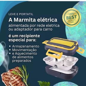 Marmiteira elétrica portátil com aquecimento rápido, bivolt (110v/220v) e compatível com veículos (12v/24v). Fabricada em aço inoxidável 304 e plástico, com potência de 40W e capacidade de 1.5 litros. Inclui colher, garfo, cabos de energia e manual.Lâmpada piloto