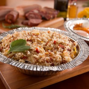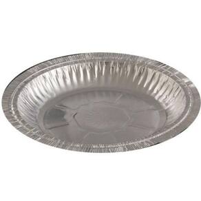 Marmitex de alumínio com tampa em papel cartão plastificado, fechamento manual.