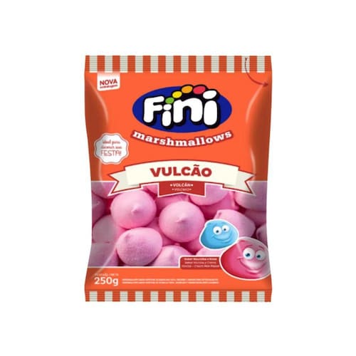 Pacote contendo marshmallow Fini Vulcão Rosa sabor artificial de baunilha e nata. Colorido e Aromatizado artificialmente. Peso líquido 250 gramas.