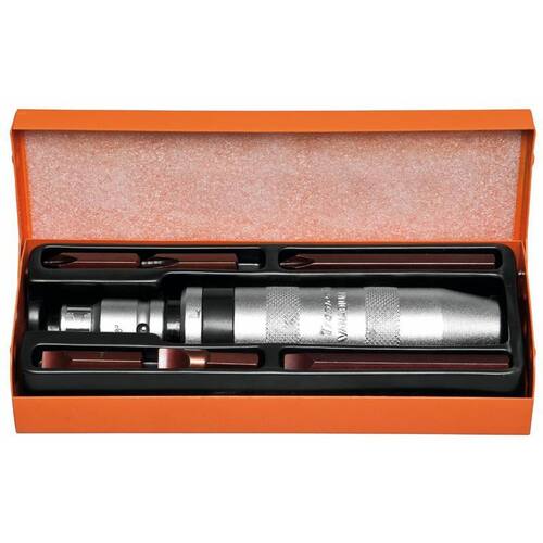 DIFERENCIAIS Corpo em aço cromo vanádio.Remover e apertar parafusos de fenda chata e cruzada.Conteúdo:martelete de impacto; adaptador para ponteiras; 3 pontas chatas em aço ferramenta S2: 6,5x38, 8x38, 8x76; 3 pontas cruzadas em aço ferramenta S2: PH2x38, PH3x38, PH3x76; caixa metálica.As ferramentas são produzidas e testadas conforme normas específicas.