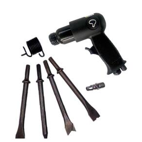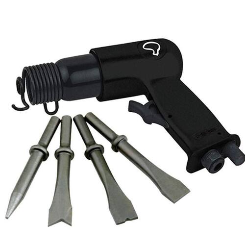 Martelete Pneumatico 4 Cinzeis Potente Brasil Martelete Pneumático 150mm com Kit de 4 Cinzéis - PNW150MT Aplicação: Projetado para facilitar o trabalho de cortar, perfurar, lascar ou raspar superfícies metálicas. Utilizado amplamente na reparação automotiva. Características: Exaustor Frontal,cano em aço temperado e pistão anti atrito,assim prolongando a vida útil da ferramenta Corpo em alumínio,com design ergonômico,tornando o trabalho mais fácil e tranquilo. ESPECIFICAÇÕES TÉCNICAS: Diâmetro da haste do cinzel: 10.2 mm encaixe redondo Velocidade Livre: 4500 BPM Curso do Martelo: 43 MM Consumo de Ar:4 CFM / 113L /Min Pressão do Ar: 90 PSI 6,3kg/cm Entrada de Ar:1/4 Comprimento:151 MM / 15 CM / Peso: 1,65 Kg