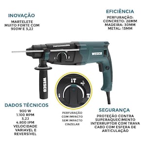 Martelete romp perfurador wesco 900w 3,2j ws3228k + mandril Voltagem: 220v Martelete rompedor perfurador modelo ws3228k com 900w de potência Com maleta, ponteiro, talhadeira, brocas, adaptador e mandril Martelete perfurador/rompedor - 28 mm - 900 w Excelente performance e custo-benefício Dados técnicos 4 funções: perfurar com e sem impacto, rompimento e giro de 360 da talhadeira; Velocidade variável e reversível; Proteção contra superaquecimento; Cabo com de articulação para maior durabilidade; com trava de segurança. Potência nominal: 900 w; Rotação: 0-1.100 rpm; Energia de impacto: 3,2 j; Impactos por minuto: 0-4.800 ipm; Encaixe: sds-plus; Peso: 3,2 kg; Capacidade máxima de perfuração: Perfuração concreto: 28 mm; Perfuração madeira: 30 mm; Perfuração metal: 13mm. Itens que acompanham a máquina: -01 empunhadura auxiliar; -01 limitador de profundidade; -03 brocas de 6/8/10 x 150 mm; -01 ponteiro; -01 talhadeira; -01 maleta plástica; -01 adaptador de mandril; -01 mandril 1/2. Marca: Não Informado Ean: 7909463121853
