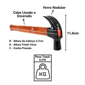 Martelo Unha Cabo de Madeira Envernizado Cunha Pressão 27mm, também conhecido como martelo orelha ou martelo de carpinteiro, é aquela famosa versão da ferramenta, que tem uma estrutura na parte de trás da cabeça, a 'unha', utilizada para retirar pregos com mais facilidade.
