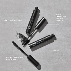 3INA MAKEUP - Máscara The 24h Level Up Resistente al Agua 900 - Máscara negra para volumen y longitud - Máscara de definición extrema tipo tubing con aplicador en forma de reloj de arena - Ideal para ojos sensibles - Vegana - Libre de crueldad animal - USO SIN MIEDO: Esta fórmula resistente al agua mantiene el rizo y añade profundidad para un impacto duradero. Obtén una definición audaz y los beneficios de una máscara voluminizadora sin que se desmorone ni manche. - VOLUMEN Y COMODIDAD 24 HORAS: Disfruta de un levantamiento serio con resultados de volumen y longitud aptos para uso diario. La fórmula suave también funciona como máscara hipoalergénica, perfecta para ojos sensibles. - PIGMENTO INTENSO: Una sola capa de máscara negra resistente al agua satura instantáneamente las pestañas con un color intenso. Esta máscara negra realza la mirada y se mantiene impecable ante la humedad, el sudor o la lluvia. - DRAMA SIN PESO: Esta máscara alargadora agarra cada pestaña para extenderla y amplificarla visiblemente. Su textura suave se construye fácilmente siendo ligera pero efectiva para dar volumen. - CONFIANZA EN FÓRMULA LIMPIA: Elaborada como máscara orgánica, es vegana, libre de crueldad y nunca irritante. Una opción pensada para quienes necesitan máscara para ojos sensibles sin comprometer el rendimiento.