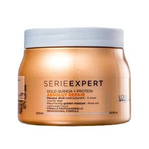 A Máscara Capilar L'Oréal Professionnel Absolut Repair Gold Quinoa+Protein é um tratamento intensivo de reconstrução instantânea para cabelos danificados. Combate a porosidade e o frizz, deixando os fios saudáveis e bonitos. Atua na reparação da fibra capilar extremamente fragilizada para que o cabelo revele uma aparência mais saudável. Seu visual ganha muito mais brilho e um toque macio incrível. Graças a ação das proteínas vegetais de alta afinidade com proteína natural dos fios, repreenche as áreas esvaziadas desde o mais profundo interior da fibra até as cutículas, além de formar um filme de força e proteção contra novos danos. Sua textura rica e envolvente repara instantaneamente os fios médio a grossos com danos extremos e que possuem necessidade de controle e disciplina.