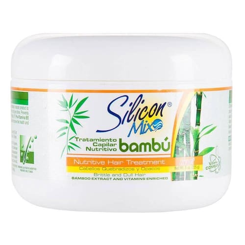 Máscara Capilar Nutritivo com Bambu Silicon Mix 225G Máscara para cabelos opacos e quebradiços. Silicon Mix Bambú Tratamento Capilar Nutritivo nutre, regenera e fortalece os fios. Ele previne a quebra e as pontas duplas. Livre de crueldade Este produto é feito sem machucar nenhum animal. É vegano Este produto é feito com elementos naturais de origem vegetal. Silicon Mix Bambú Tratamento Capilar Nutritivo fecha as cutículas capilares, tornando a superfície das fibras capilares mais suaves. Sua fórmula é rica em óleos naturais, vitaminas. Aumenta a resistência do cabelo com brilho e toque macio. Modo de utilizar: Após lavar o cabelo com o Shampoo Silicon Mix Tratamento Nutritivo de Bambú, distribuir no cabelo molhado aplicando a quantidade de 1 a 2 vezes em todo o comprimento e nas pontas do cabelo e massagear delicadamente. Deixar agir de 2 a 3 minutos dependendo da condição do cabelo, enxaguar abundantemente. Para melhores resultados use também o Silicon Mix Leave-in Nutritivo de Bambú.
