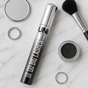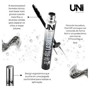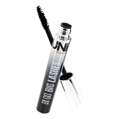Máscara de cílios na cor preta. UNImakeup Go Big Lashes promove volume intenso e garante longa duração, além de definir os fios.