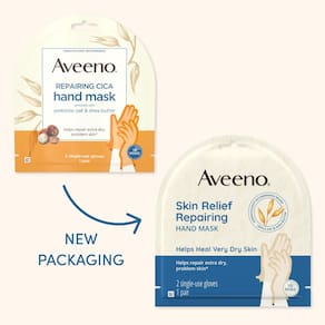— pacote com um par de máscaras reparadoras para mãos Aveeno Skin Relief, luvas hidratantes de uso único formuladas com aveia tripla e manteiga de karité para ajudar a curar a pele muito seca em 10 minutos