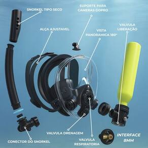 O snorkel permite a respiração natural na superfície, enquanto o cilindro de oxigênio portátil com capacidade de 0,5L fornece autonomia de 5 à 7 minutos submerso, ideal para iniciantes e profissionais, sendo perfeito para mergulhos leves, observação marinha e treinos de respiração.